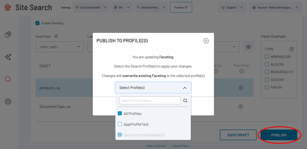 When you Publish changes to the Facets list, Site Search gives you an opportunity to copy the full list to your selection of profiles. (The feature overwrites the selected Profiles with the current Facets list.)