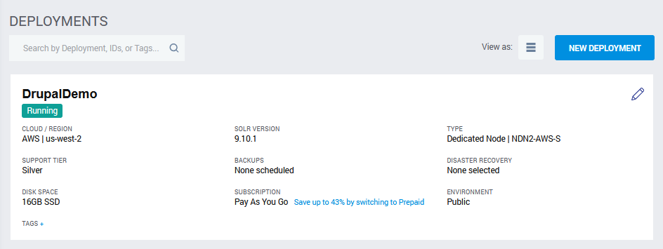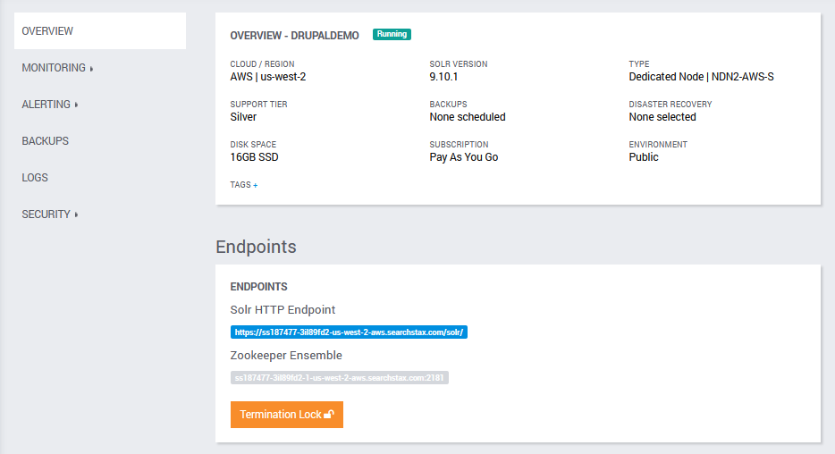 Clicking on the name of the deployment will give you pertinent information about your deployment’s servers. The Solr HTTP Endpoint will take you to your Solr server dashboard.