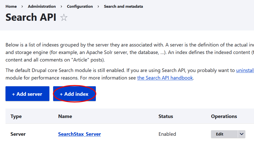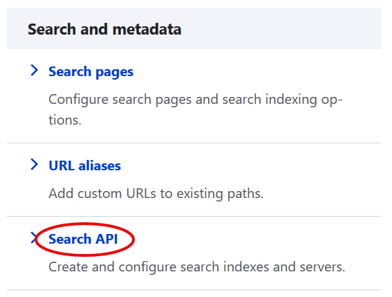 Now that the modules have been enabled, click on the Drupal website’s Manage > Configuration tab. Look for section Search and metadata and click on Search API to configure it.