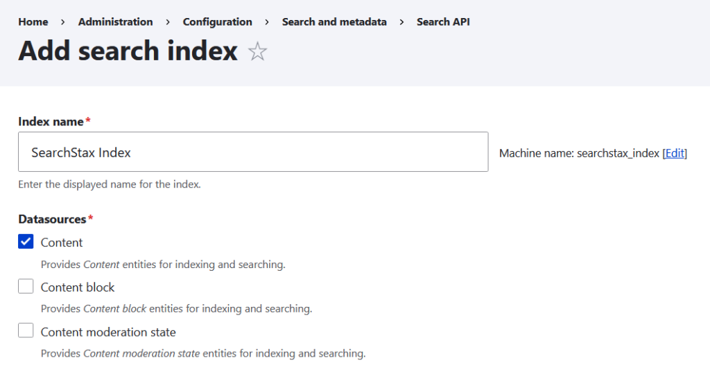 Give your index a name, and select the data sources you wish to index. For this example, select Content.
