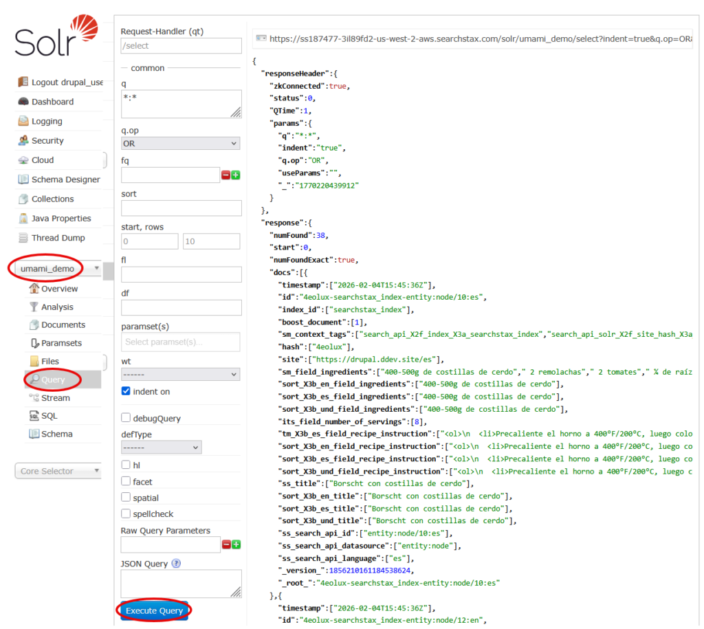 After your site has been indexed, you can view and query the data in Solr. In your Managed Search deployment, click the Solr HTTP Endpoint to view the Solr dashboard. Solr will ask for your user credentials, from Step 1 above. Then select the index and click Query. Finally, click Execute Query at the bottom of the form.