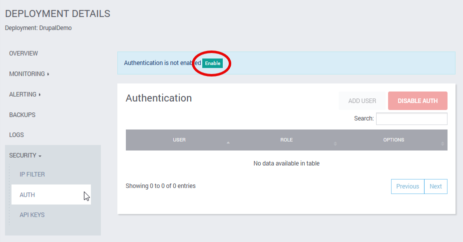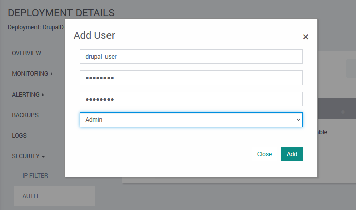 Click on Auth in the Security tab to create an Authentication username and password. Enable Auth.