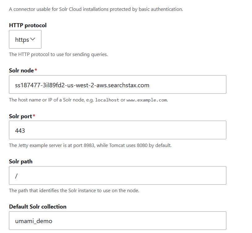 Selecting Solr Cloud with Basic Auth opens new controls on the form. Check that HTTP protocol is set to https. The Solr node is the deployment’s Solr HTTP Endpoint without the https:// prefix and the trailing /solr/ element. The port is 443. The Solr path is /. The Default Solr Collection is the Collection you created in step 2.