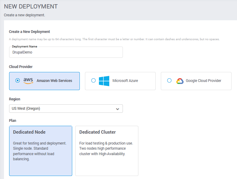 Assuming you have already created a SearchStax account and do not already have a deployment set up, click on the Dedicated tab and then click on the Create New Deployment button at the top. Enter a deployment name, and select the most appropriate region, plan, and Solr version for your needs. In this example we will be using Solr 9.10.1.