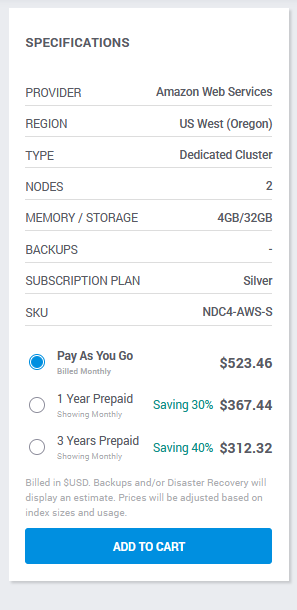 The prices shown when creating a new deployment in Managed Search are the month-to-month self-service rates. Much lower rates apply to annual commitments, sometimes as much as 50% lower! Please contact us for further information.