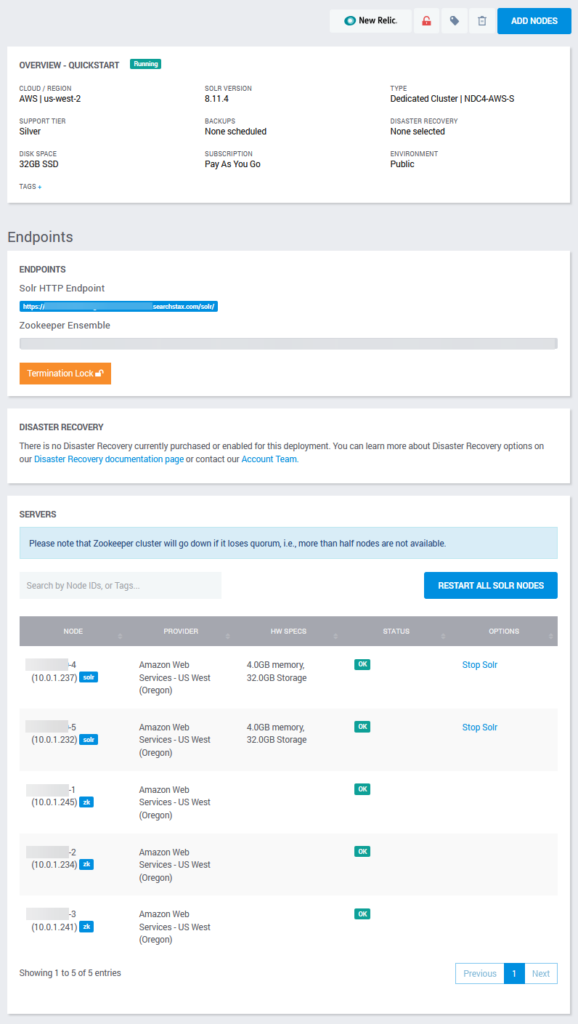 The SearchStax dashboard lets you add more nodes later, up to a total of 10 add-on nodes.