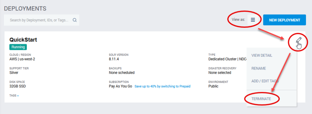 There are rare occasions when a new deployment fails to complete the setup and configuration process. In that case, the trash can icons are unavailable. Select the “Card” view of the deployment list and click the Edit Pencil icon. This exposes a menu where the final option is “Terminate.”