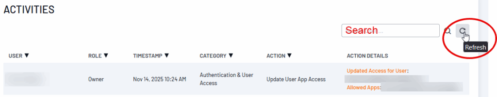 We call your attention to the Search field above the Activity table. Enter a user name, an App name, a Category, or any other specific term that is visible in the log entries to filter the list.