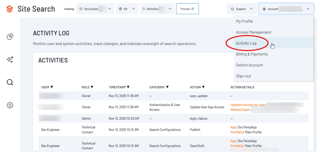 The SearchStax Site Search solution offers a table of user actions during the previous ninety days. This helps the team to debug issues, maintain oversight, and meet compliance standards. Specifically, the Activity Log records configuration and system changes made by the team’s technical users. The account’s users can view some or all of these events depending on their roles and access permissions.