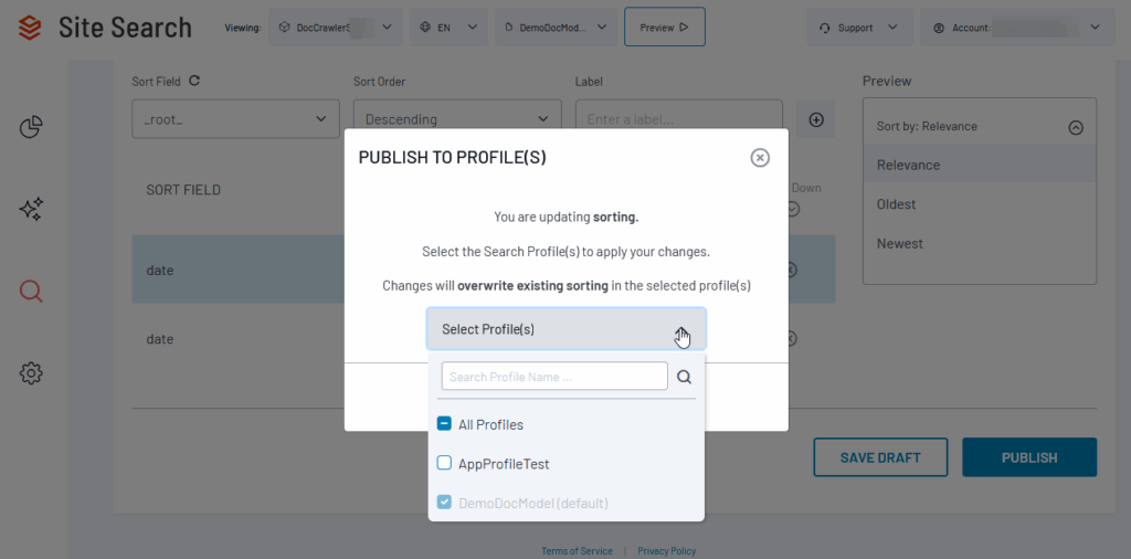 When you Publish changes to the Location feature, Site Search gives you an opportunity to copy the settings to your selection of profiles. (The feature overwrites the selected Profiles with the current Location configuration.)
