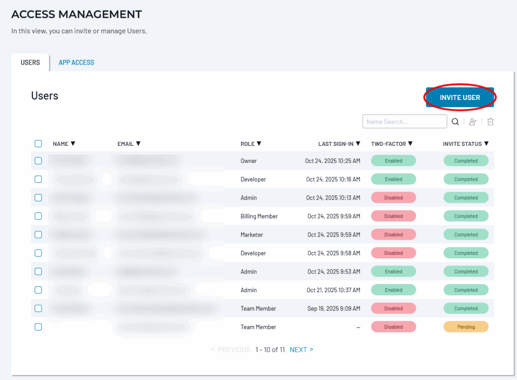 The Owner and Admins have access to the Account Management App Access tab. This presents the Owner with a global overview of the users who have access to each App. Admins have a more restricted view, showing only the Apps where they have privileges.