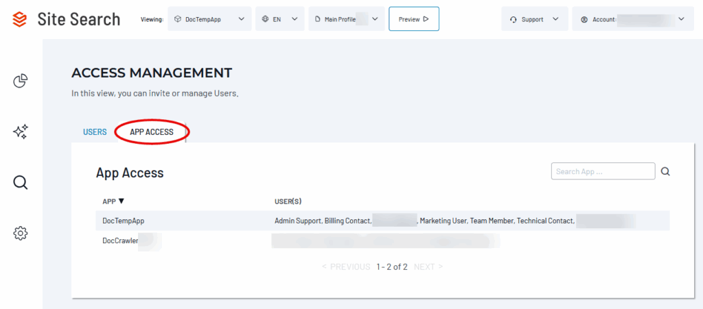 If App-level permissions are enabled for your account, the Owner and Admins can manage user access to specific Search Apps.