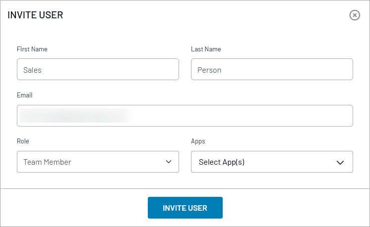 Inviting a team member requires only the person’s name, email address, and role assignment. If your account permits App-level permissions, there is also a list of Apps to choose from.