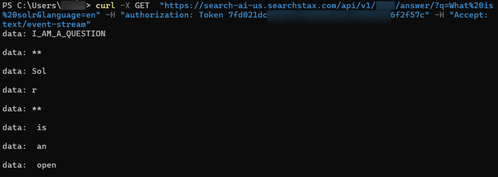 -H "Accept: text/event-stream"The method returns a stream for real-time display on your search webpage. It looks like this is a Bash or PowerShell command window: