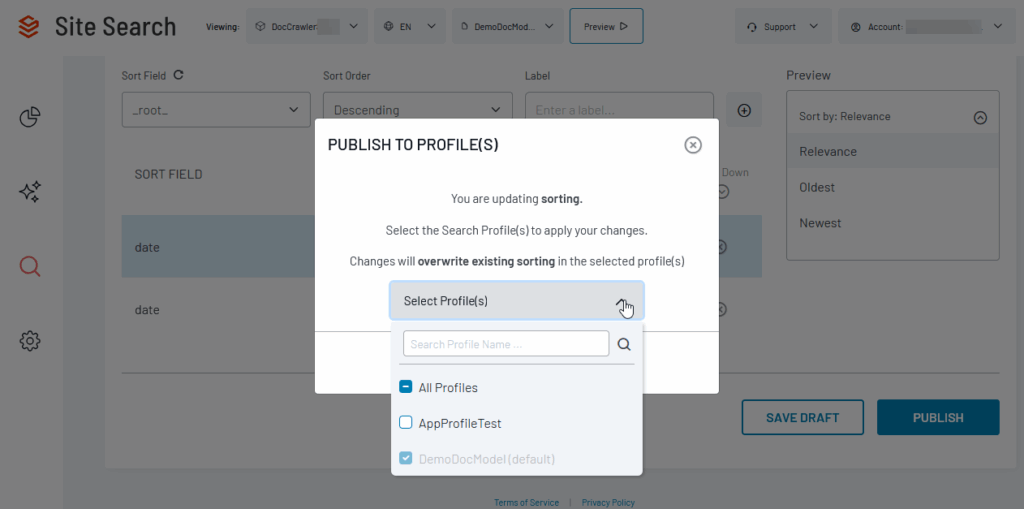 When you Publish changes to the Sorting feature, Site Search gives you an opportunity to copy the settings to your selection of profiles. (The feature overwrites the selected Profiles with the current Sorting configuration.)