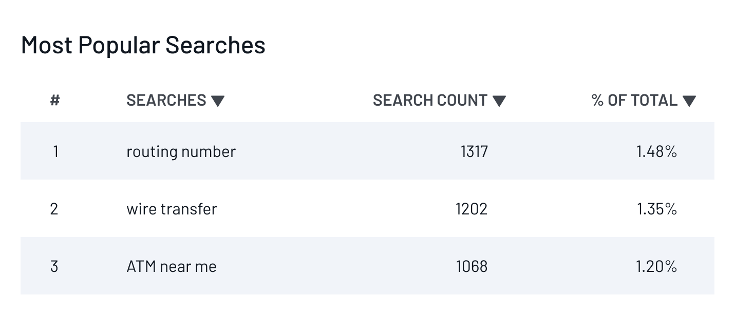 Surface top financial topics from your popular queries, “no-result” searches and trending services to inform content strategies, FAQs and digital offers.